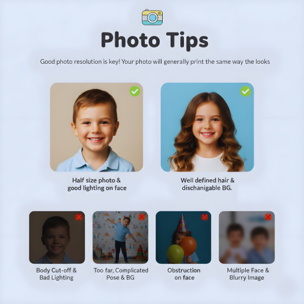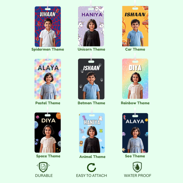 durable bag tags featuring cartoonized photo and name of your little adventurer, along with parent’s contact address and details.