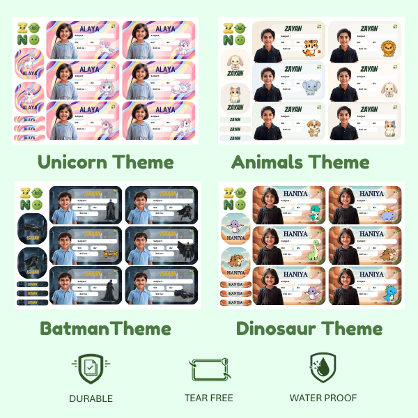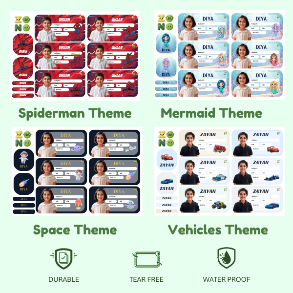 Customised nameslip with a cartoonish picture of your child name class and school.Includes 24 nameslips 8 stationery labels and 12 pen pencil labels